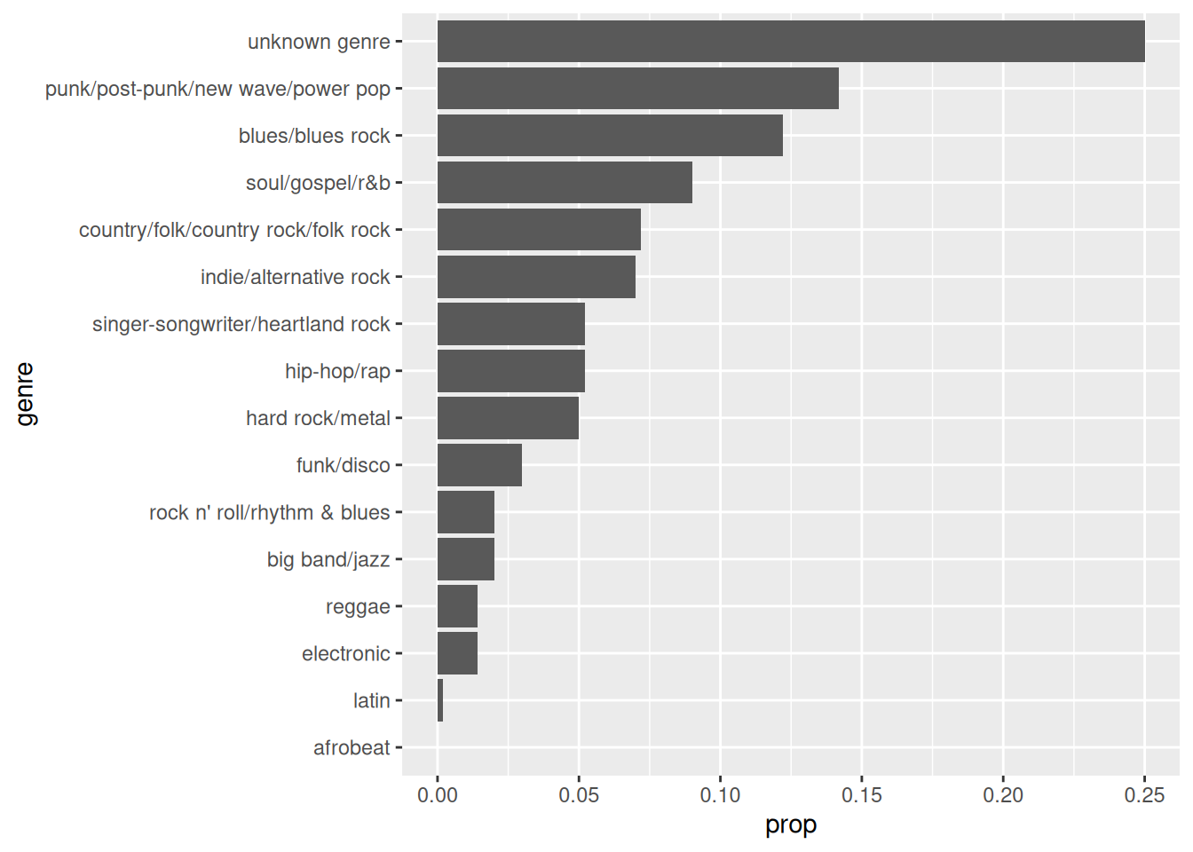 $ genre : chr "Big Band/Jazz" "Rock n' Roll/Rhythm & Blues" "Rock n' Roll/Rhythm & Blues" "Big Band/Jazz" ...