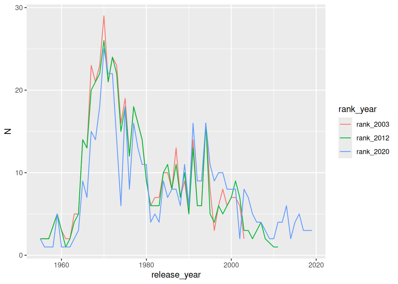 |> rolling_stone melt(id.vars = c("release_year", "album_id", "artist_gender"), measure.vars = c("rank_2003", "rank_2012", "rank_2020"), variable.name = "rank_year", value.name = "rank") |> N = sum(!is.na(rank))), _[, .(= .(decade = floor(release_year / 10) * 10, artist_gender, rank_year)] |> by dcast(decade + rank_year ~ artist_gender, value.var = "N") |> := Male / (Male + Female)] |> _[, ratio ggplot(aes(decade, ratio)) + geom_line(aes(color = rank_year))