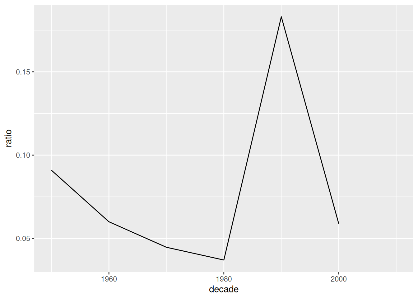 |> rolling_stone N = sum(!is.na(rank_2003))), _[, .(= .(decade = floor(release_year / 10) * 10, artist_gender)] |> by dcast(decade ~ artist_gender, value.var = "N") |> setnafill(fill = 0) |> := Male / (Male + Female)] |> _[, ratio ggplot(aes(decade, ratio)) + geom_line()